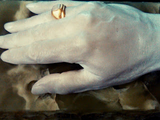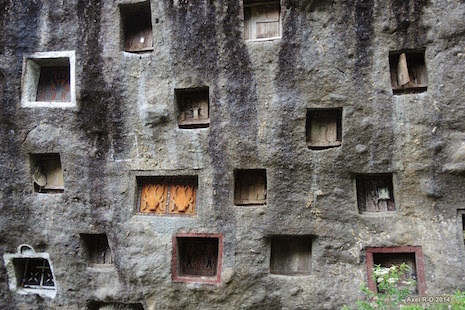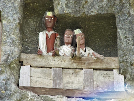 Toraja tribe members are rarely buried in the ground. They are either placed in caves dug out in the rocky side of a mountain, or in wooden coffins that are hung on a cliff. The grave is usually expensive and takes a few months to complete. A wood-carved effigy, called Tau tau, representing the deceased is usually placed in the cave looking out over the land. The coffins are beautifully decorated, but over time the wood begins to rot and the bleached bones of the deceased often drop to the bottom of the suspended burial ground.